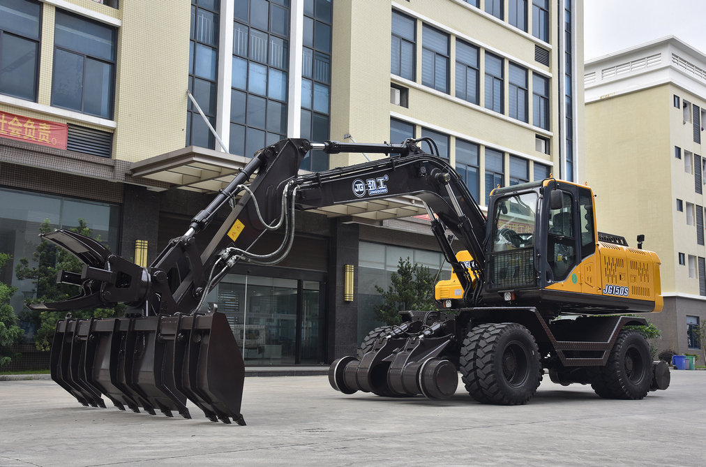 Колёсный экскаватор может передвигаться как по дороге или пересечённой местности, так и по рельсам, для чего он оснащён стальными ж.д. колёсами с системой гидравлического опускания и подъёма железнодорожных осей. Кроме стандартного ковша и навесного оборудования для экскаваторов, предусмотрено различное навесное оборудование для выполнения ремонтных работ на железной дороге: шпалоподбойки на 4 или 8 костылей, бара для выемки щебня, захват для шпал, просеиватель щебня, планировочный ковш и так далее.